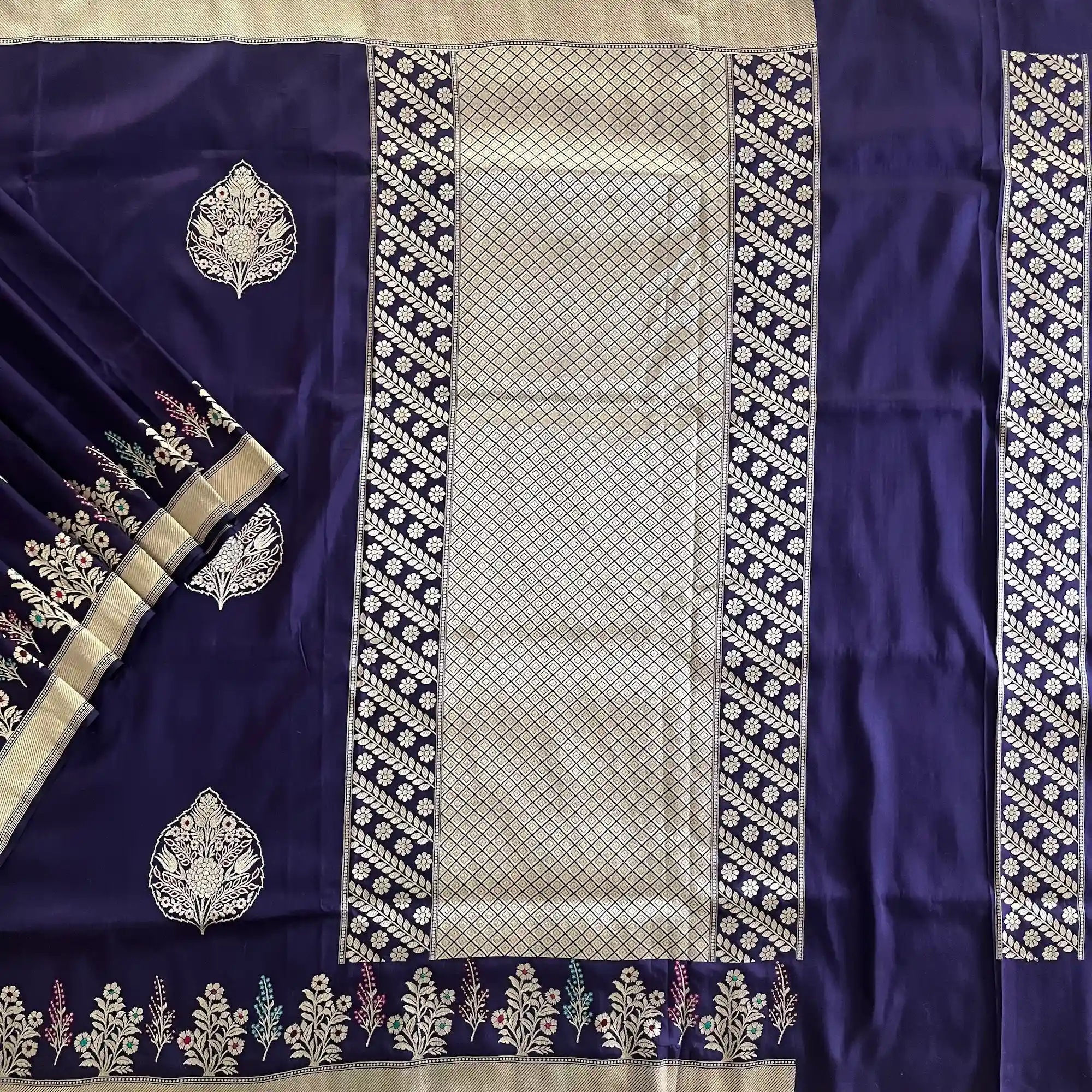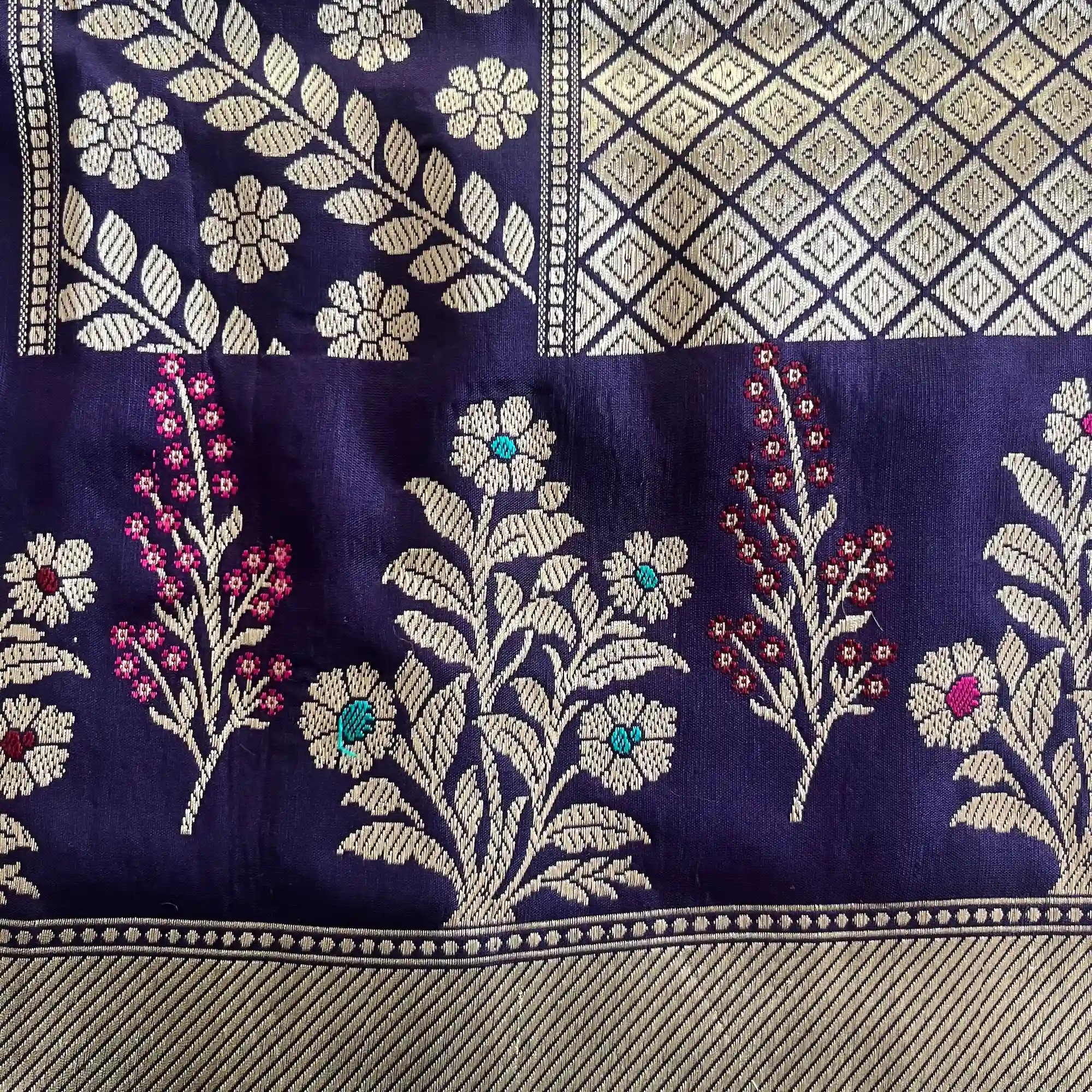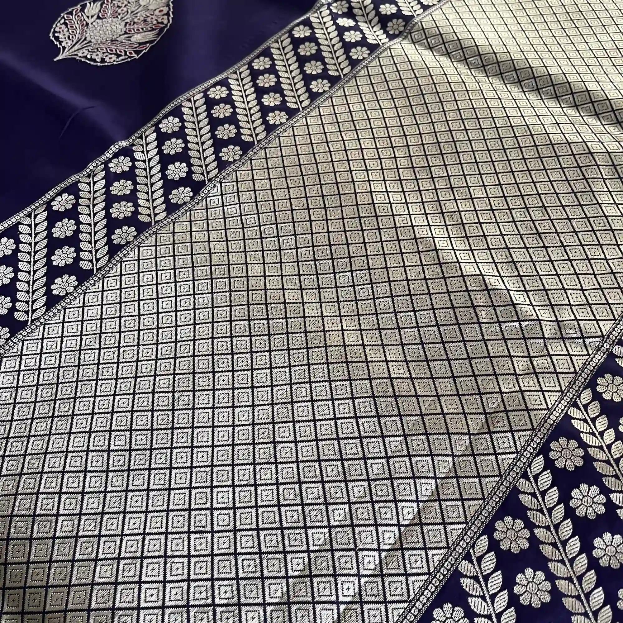 Another distinctive specialty of Banarasi handloom sarees lies in their elaborate designs and motifs. Inspired by Mughal art and Indian heritage, these sarees feature floral patterns, foliate motifs, kalga and bel designs, paisleys, and intricate jaals. Techniques such as Kadua, Brocade, Jamdani, and Tanchoi weaving add depth and dimension to the fabric, making each piece a wearable work of art. The pallu and borders are often heavily ornamented, creating a striking contrast with the body of the saree.