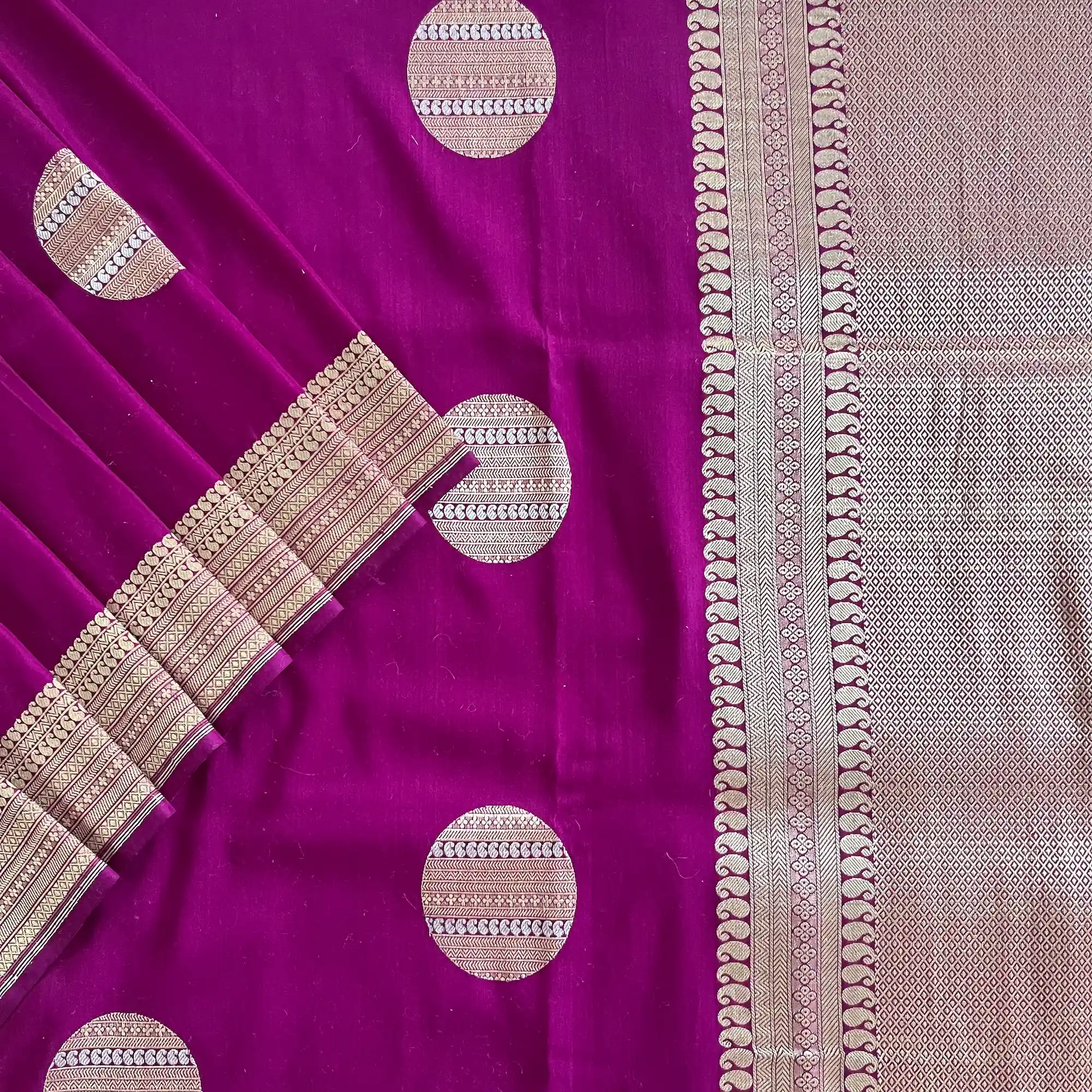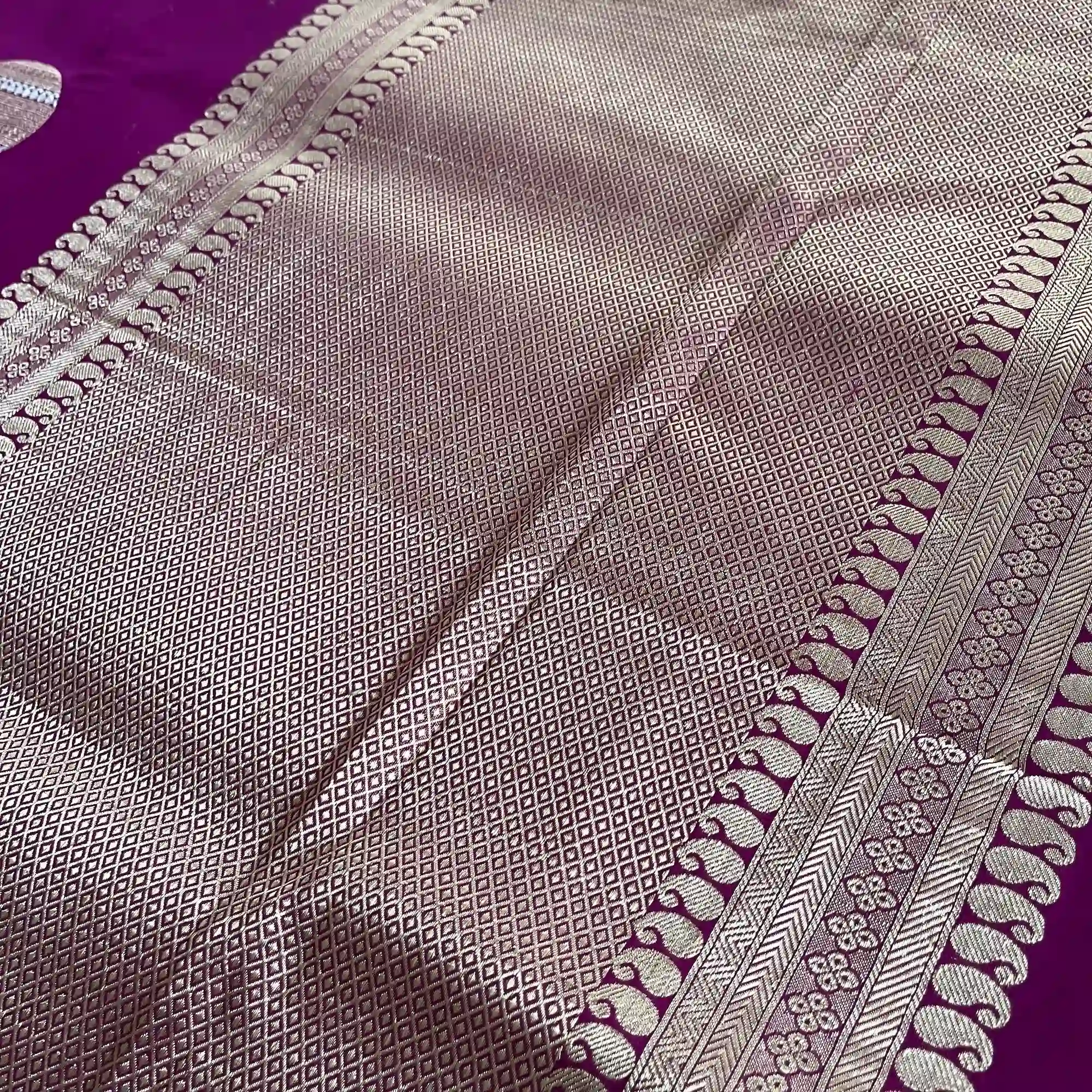 Another distinctive specialty of Banarasi handloom sarees lies in their elaborate designs and motifs. Inspired by Mughal art and Indian heritage, these sarees feature floral patterns, foliate motifs, kalga and bel designs, paisleys, and intricate jaals. Techniques such as Kadua, Brocade, Jamdani, and Tanchoi weaving add depth and dimension to the fabric, making each piece a wearable work of art. The pallu and borders are often heavily ornamented, creating a striking contrast with the body of the saree.